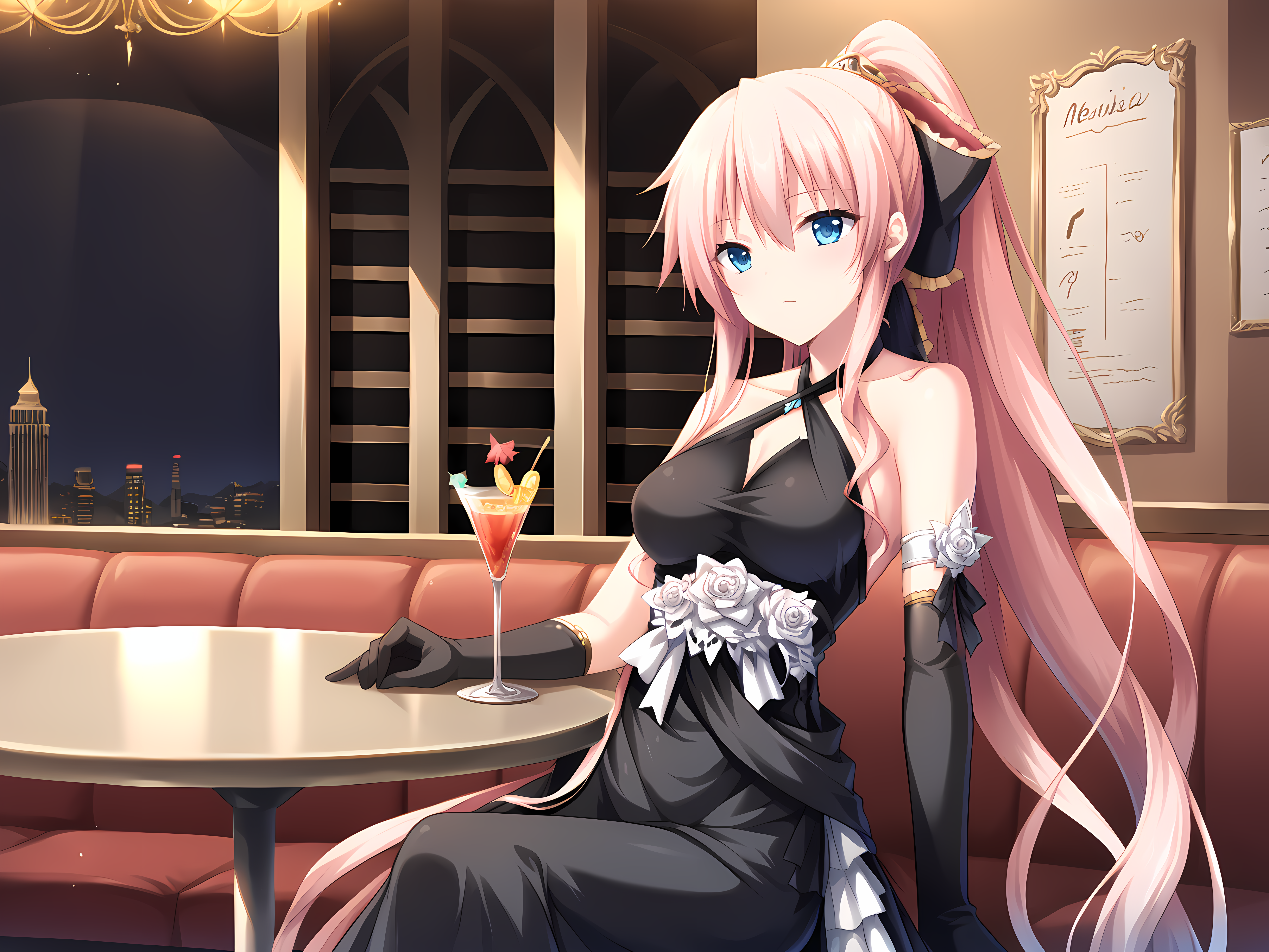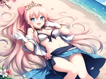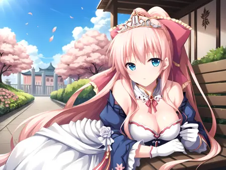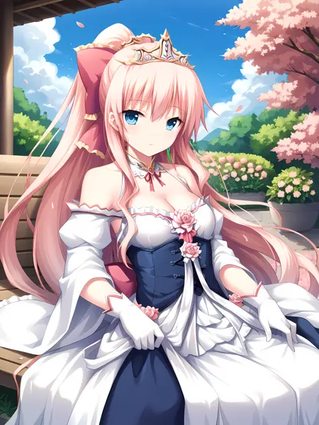 eushully, 마기레타, 1girl, 매우 긴 머리, 포니테일, 분홍색 머리, 파란 눈, 드레스, 가슴 선, 정원, 야외, 벤치, 꽃, 벚꽃, 장갑, 머리 리본, 왕관