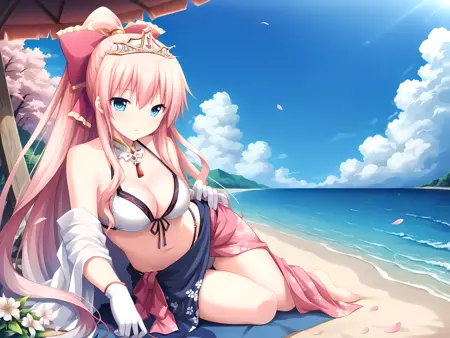 eushully, Margireta, 1girl, very long hair,ponytail,pink hair,blue eyes,dress,cleavage,garden,outdoors,bench,flower,cherry blossoms,gloves,hair bow,tiara