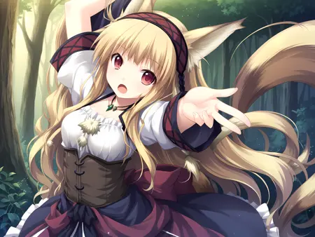 neneka, eushully, 1girl, long hair, very long hair, animal ears, blonde hair, tail, red eyes, dress, hairband,