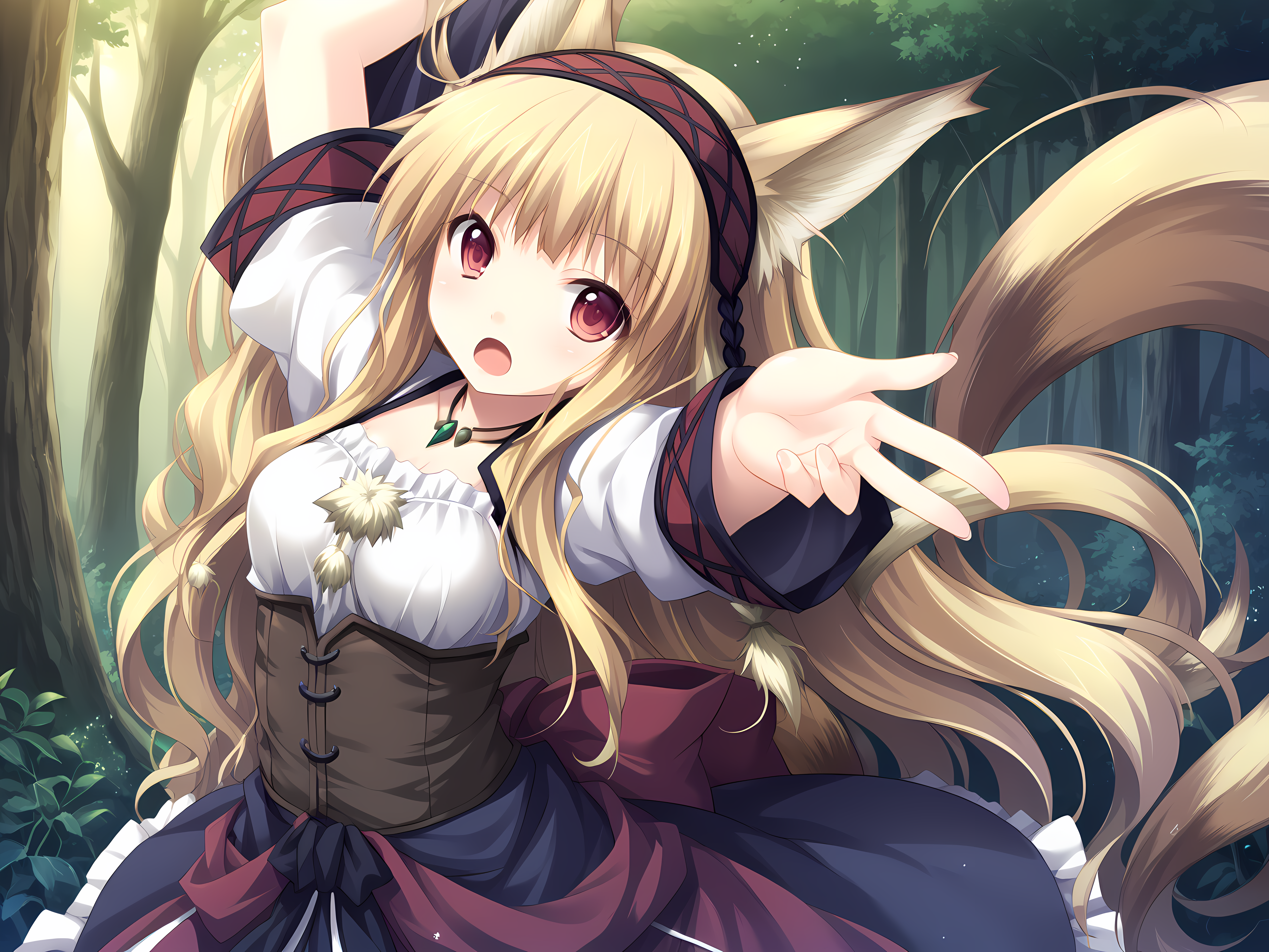 네네카, eushully, 1girl, 긴 머리, 매우 긴 머리, 동물 귀, 금발 머리, 꼬리, 붉은 눈, 드레스, 머리띠
