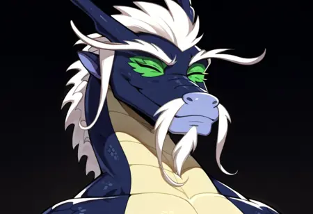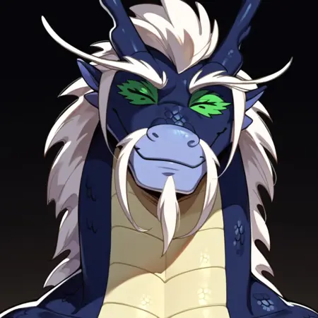 Positive Prompts: LaoShiDG, furry, feral, eastern dragon, scalie, horns, white hair, white mustache, white goatee, white eyebrows, blue body, yellow body, two tone body, green sclera, black eyes, tail, claws