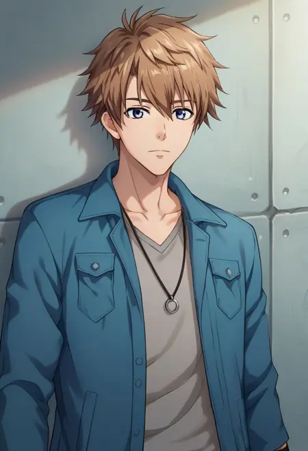 yuto, 1boy, male focus, solo, brown hair, hair between eyes, blue eyes, collarbone, jacket, blue jacket, open jacket, open clothes, shirt, grey shirt, wristband, pants, jewelry, necklace,