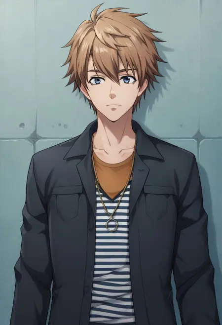 yuto, 1boy, male focus, solo, brown hair, hair between eyes, blue eyes, striped, striped shirt, jacket, black jacket, open jacket, open clothes, pants, black pants, boots, brown footwear, jewelry, necklace,