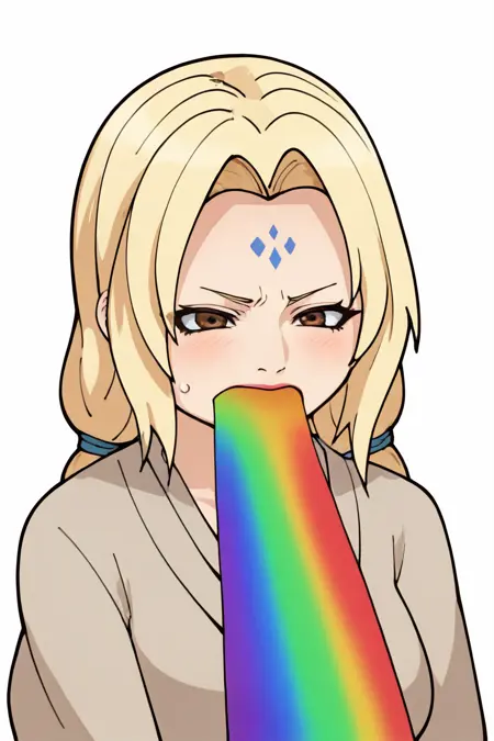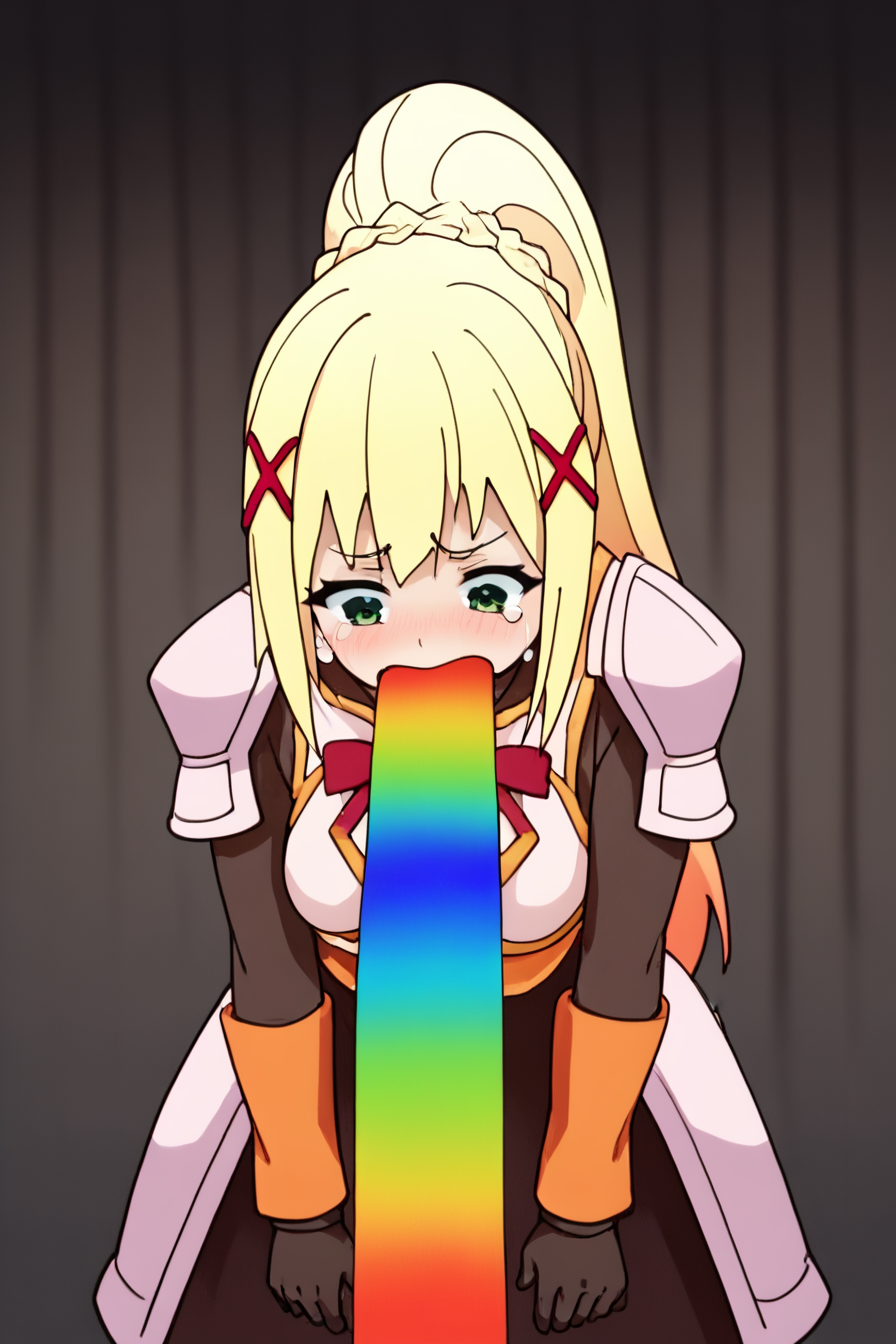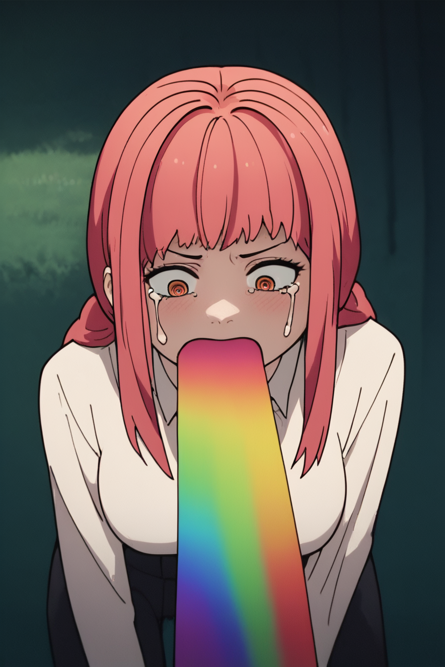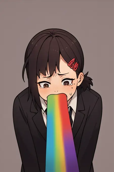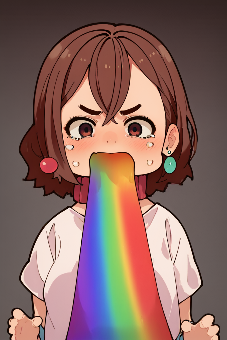 looking down, leaning forward, tears, disgust, rainbow, vomiting rainbows, vomit