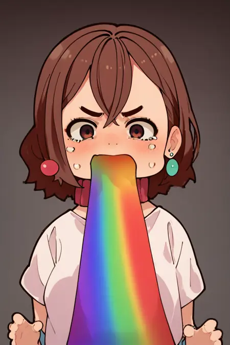 プロンプト2: チビ、虹、下を向いて、涙、嫌悪、虹を吐く、吐き気