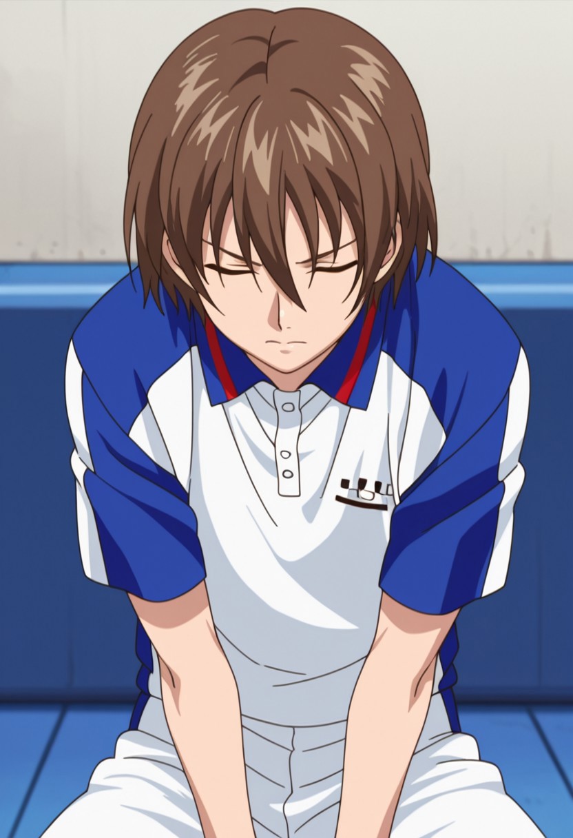 shusuke, 1个男孩, 男性焦点, 单人, 棕发, 发丝遮眼, 蓝眼, 网球服, 白色衬衫, 蓝色衬衫, 短袖, 短裤, 白色短裤, 袜子, 白色袜子, 鞋子, 运动鞋,
