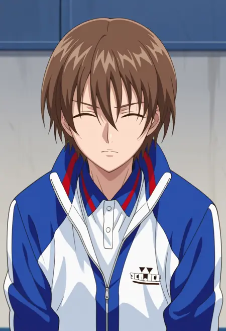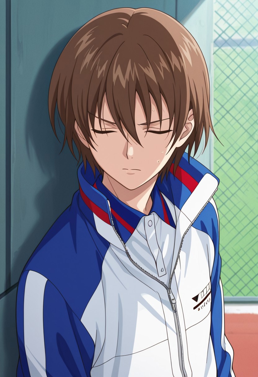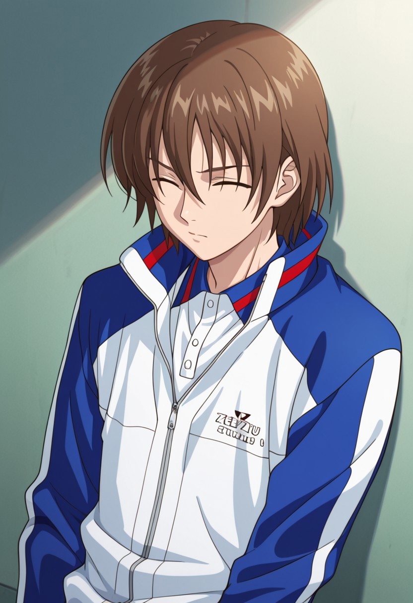 1个男孩, 男性焦点, 单人, 闭眼, 棕发, 发丝遮眼, 网球服, 运动夹克, 白蓝配色夹克, 部分拉开拉链, 马球衫, 蓝色长裤, 运动鞋,