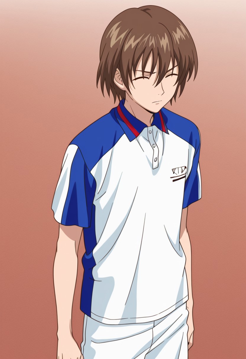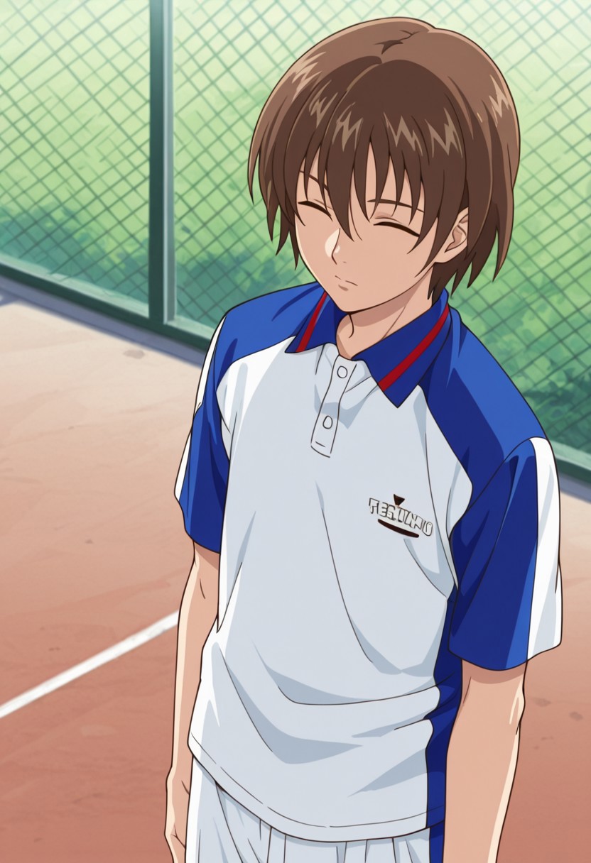 1个男孩, 男性焦点, 单人, 闭眼, 棕发, 发丝遮眼, 网球服, 马球衫, 白蓝配色衬衫, 短袖, 肩部接缝袖, 白色短裤, 白色袜子, 运动鞋,