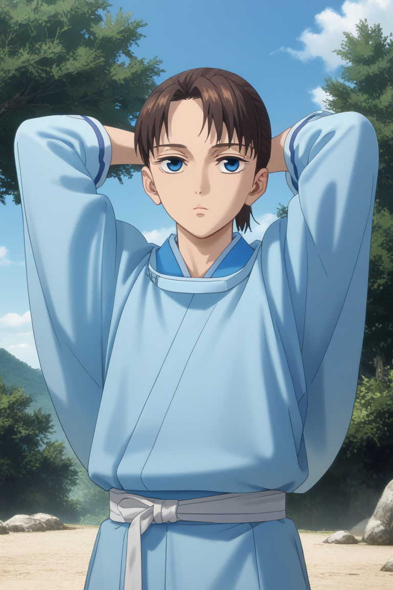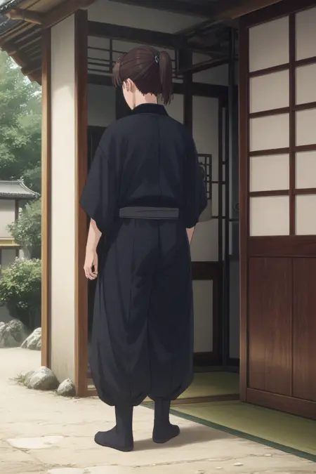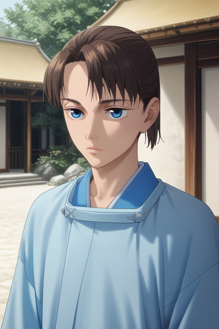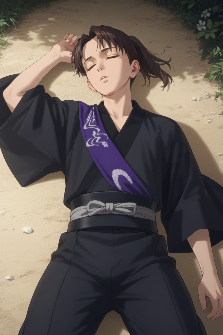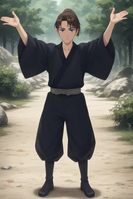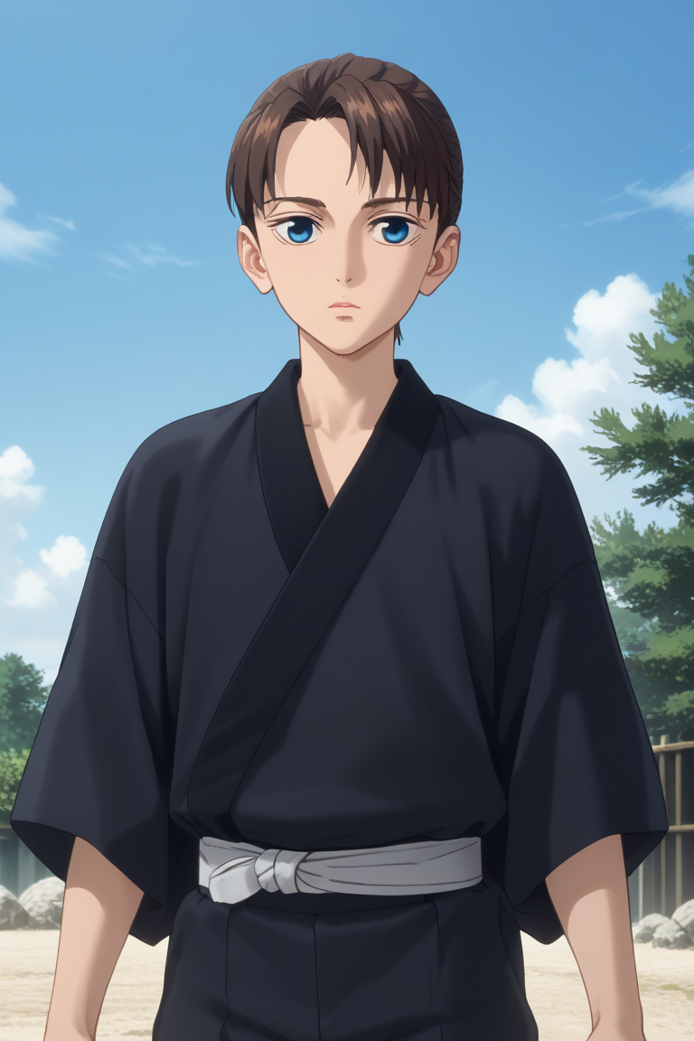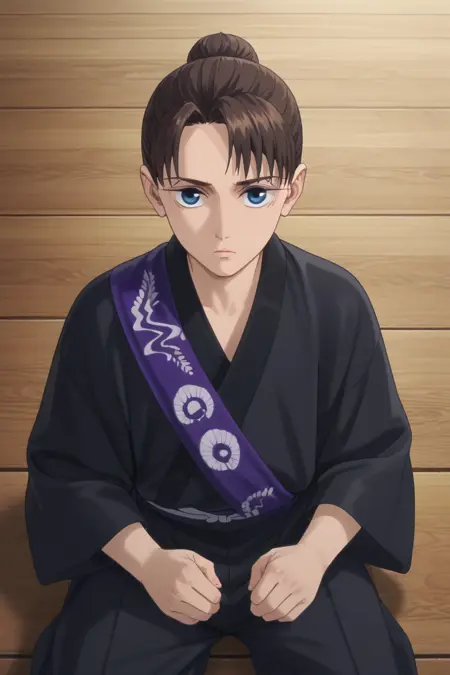 ユキヤ、茶色の髪、青い目、ポニーテール、和服、黒い着物、灰色の帯、黒いズボン、紫の帯