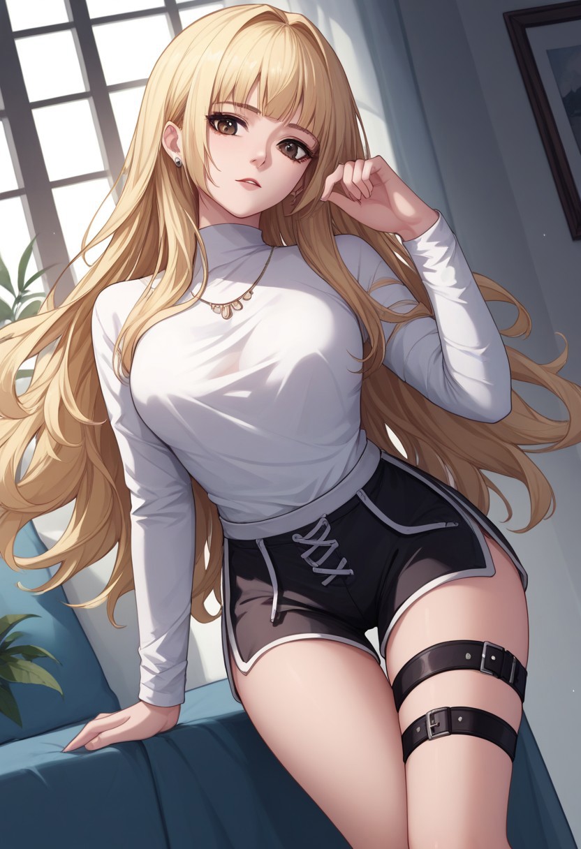 Liu doudou, white shirt, midriff, brown eyes, blonde hair, jewelry,