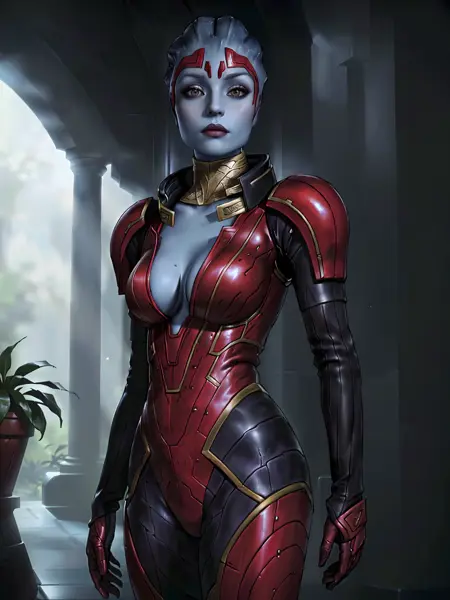 例: masseffectsamara standing in a room / masseffectsamaraが植物のある中庭に立つクローズアップ / masseffecsamaraのポートレート。