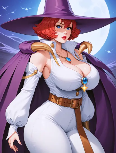 TessaTabasaV2, 1girl, solo, short hair, red hair, blue eyes, witch, witch hat, lips, lipstick, big breast, big boobs, large breast, cleavage, thick thighs, necklace, sleeves, long sleeves, detached sleeves, bare shoulders, white blouse, cape, purple cape, white pants, belt, brown boots,