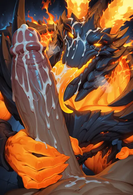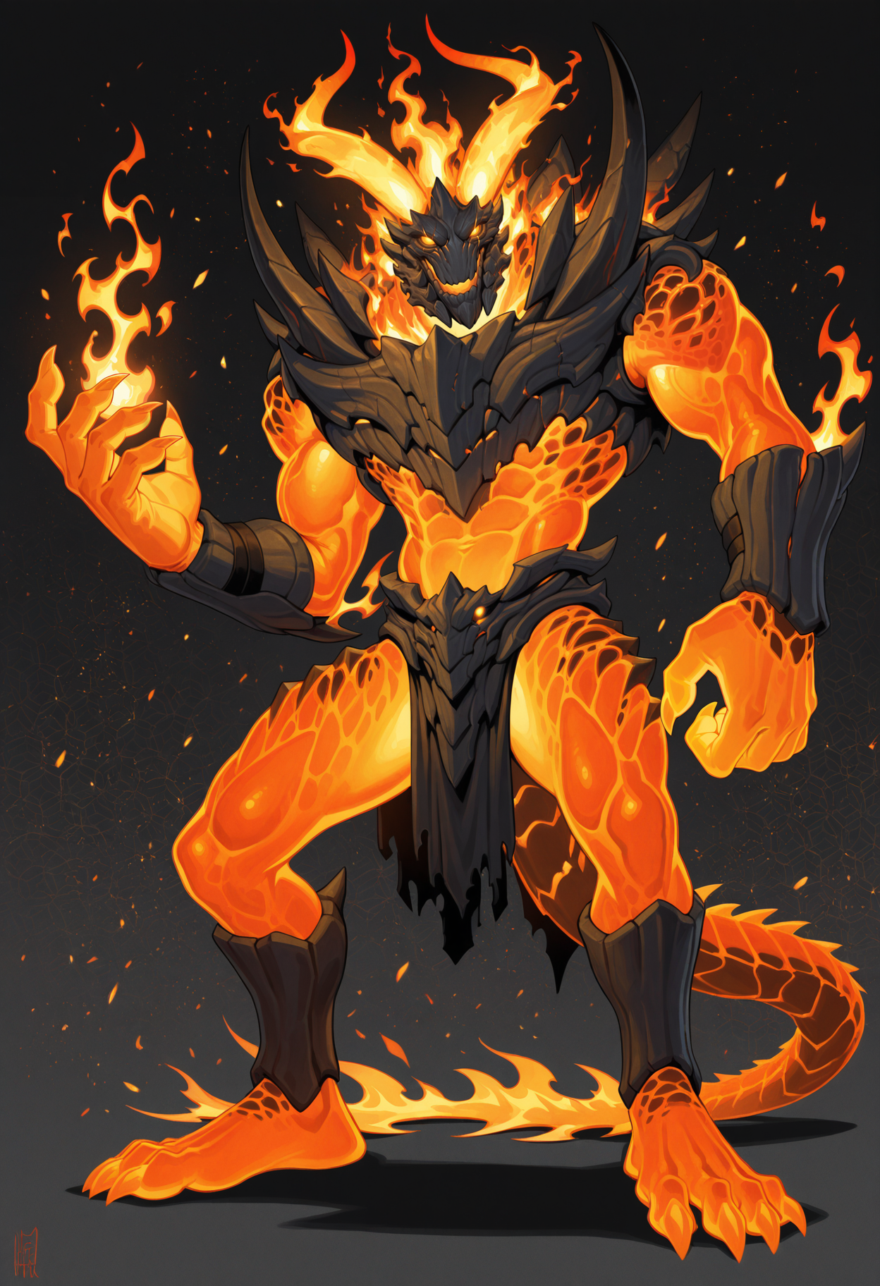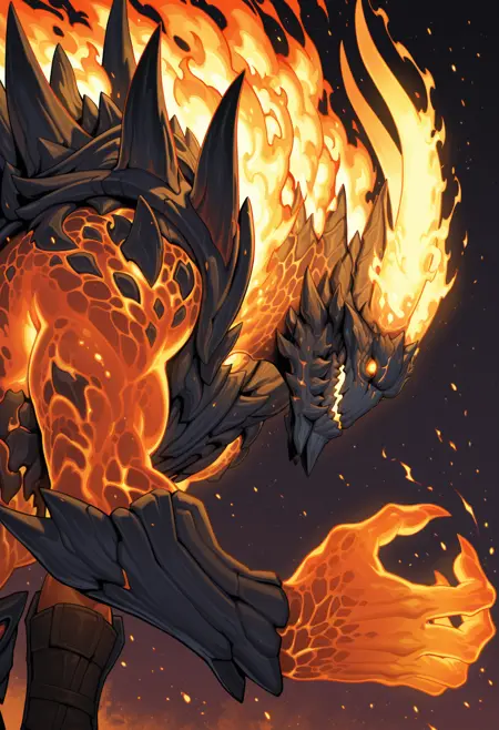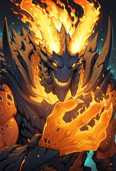 トリガーワード: fyrakk, horns, monster, glowing eyes, lava creature, orange body