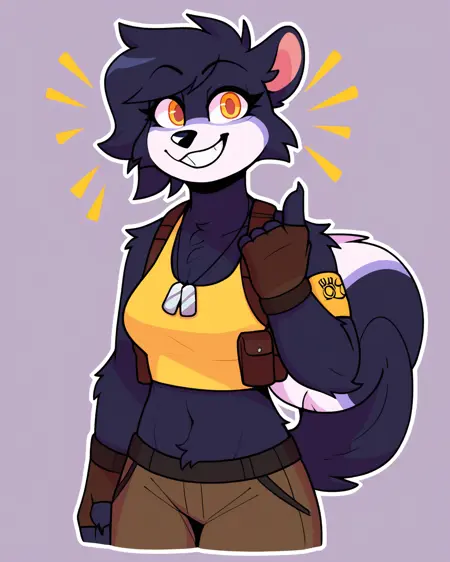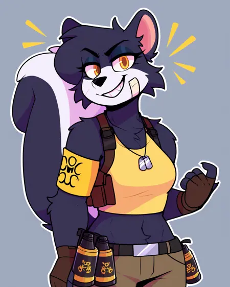 Trigger Words: skunk, furry female, female, furry, yellow eyes, fingerless gloves, dog tags, yellow sports bra, midriff, pants, tail, combat boots,
