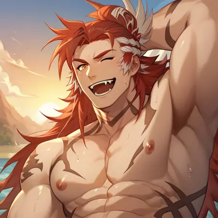 基础(illustrious):w1ln4s_gbf,橙色眼睛,红发,多色头发,长发,身体纹身,黑色亮漆,肌肉发达的男性