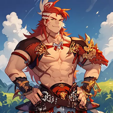 默认服装(illustrious):w1ln4s_gbf,橙色眼睛,红发,多色头发,长发,身体纹身,黑色亮漆,肌肉发达的男性,肩甲,皮带,红裤,护手
