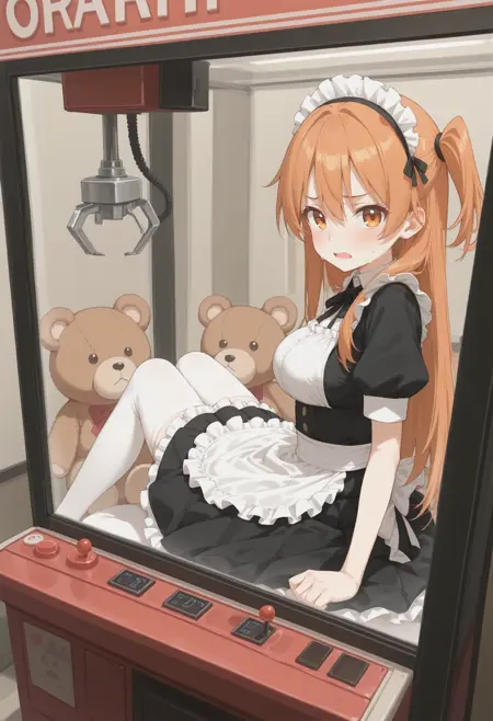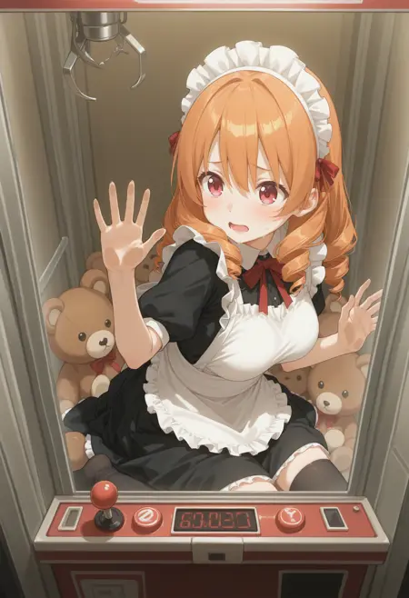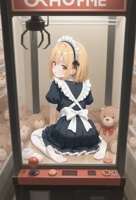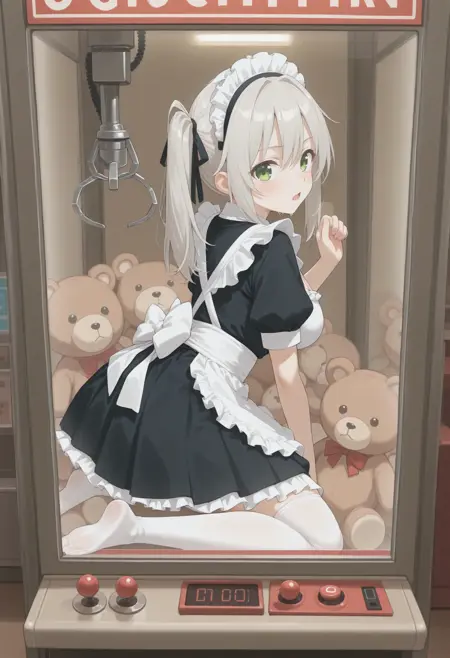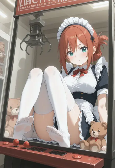 트리거만 사용하면 단순히 UFO 캐쳐 같은 캐비닛 안에 있는 상태이므로, crane game, sitting, thighhighs, indoors, in container, arcade, arcade cabinet, phone, phone booth, against glass, reflection, wide shot, soles 등의 요소를 추가로 사용해야 합니다. 다른 상품을 명확히 지정하지 않으면 이상한 물체가 생성되므로 샘플에서는 테디 베어를 포함했습니다.