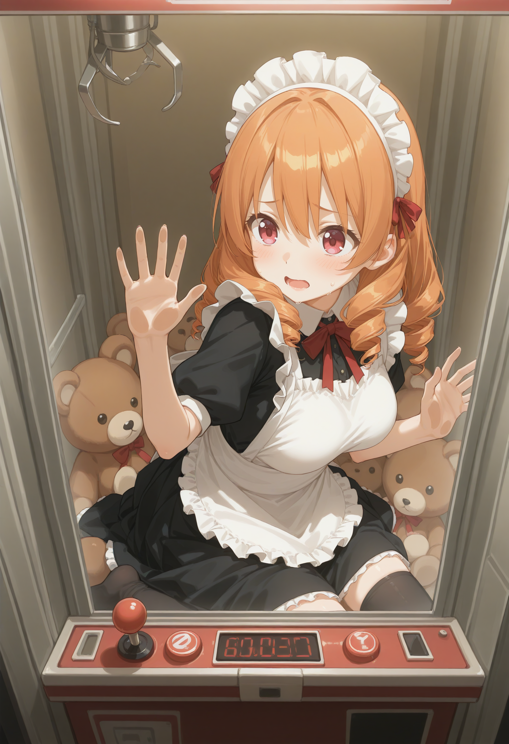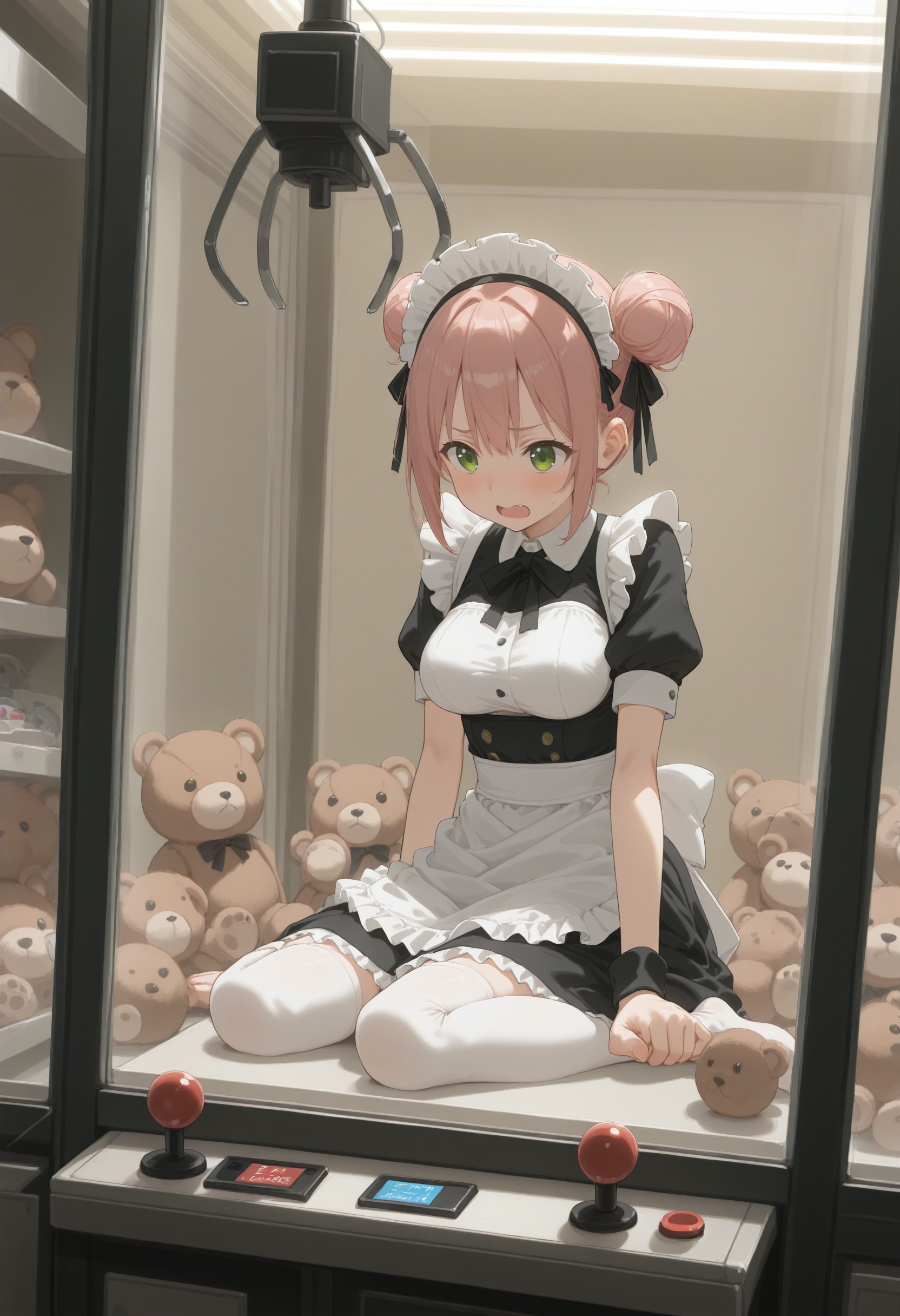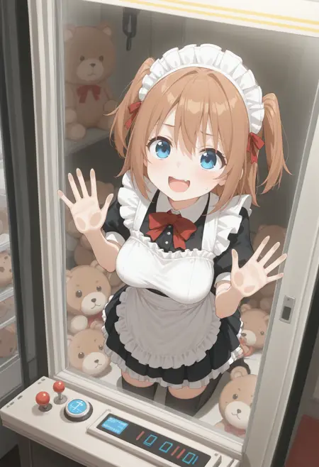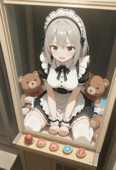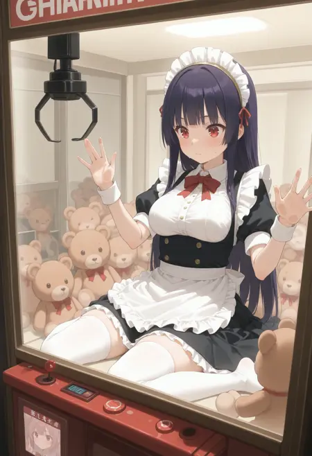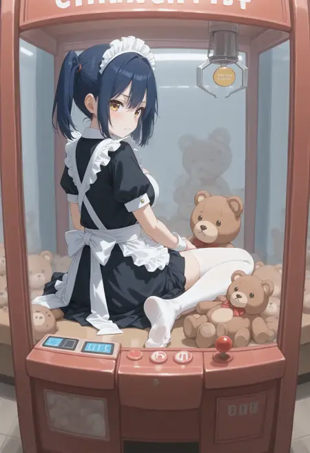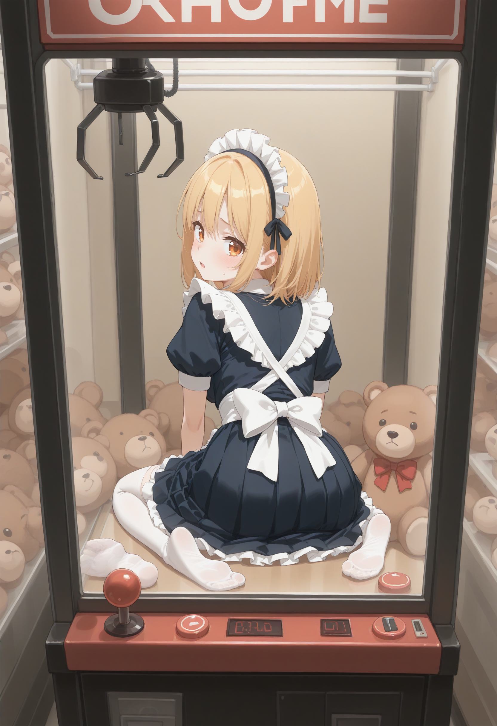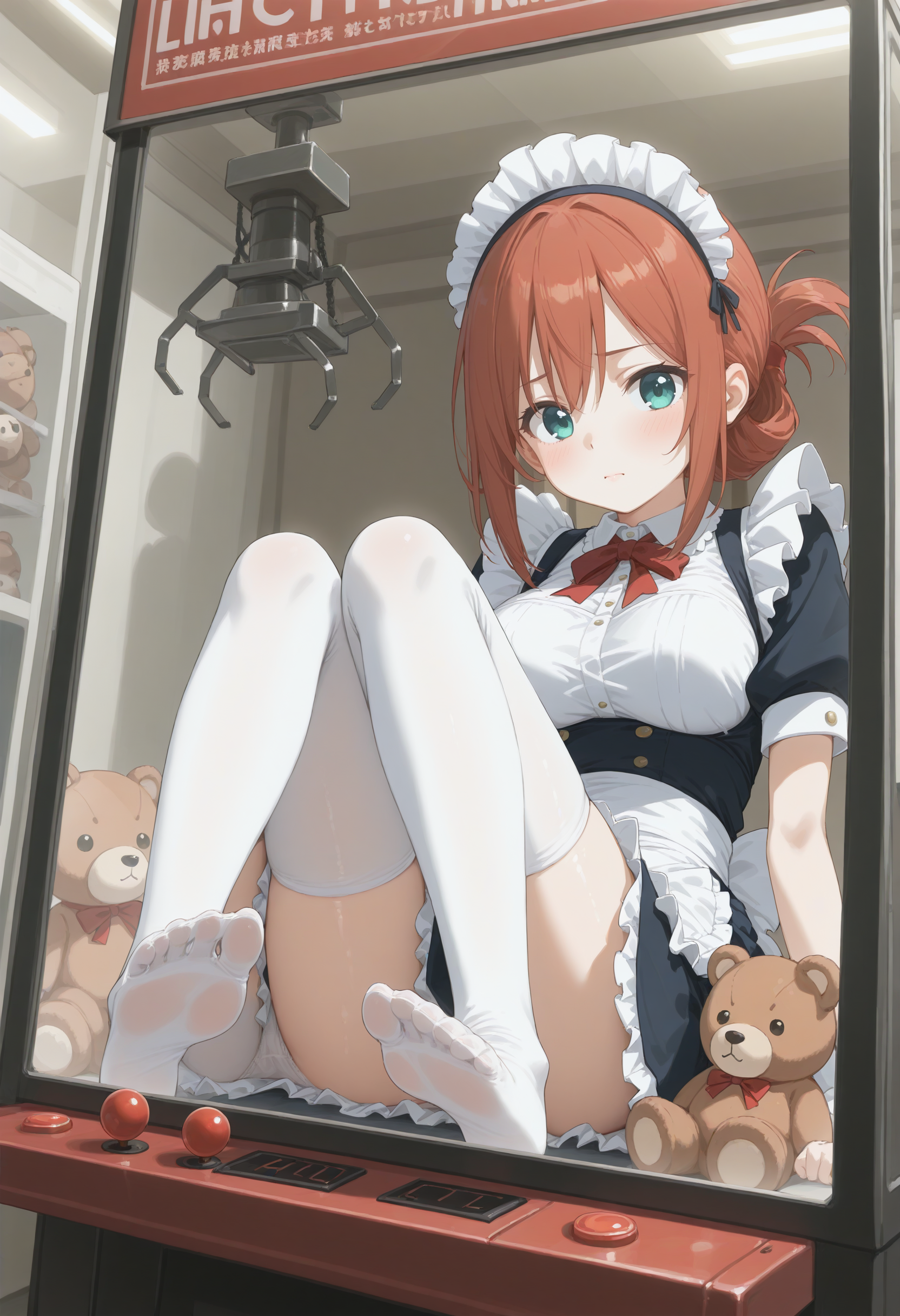 トリガーだけだと普通にUFOキャッチャー的な筐体の中にいるだけなので crane game, sitting, thighhighs, indoors,in container, arcade, arcade cabinet, phone, phone booth, against glass , reflection,wide shot,soles 辺りから必要な物を入れて下さい。他の景品は明確に指定してあげないと謎の物体を量産するのでサンプルでは teddy bear を入れています。
