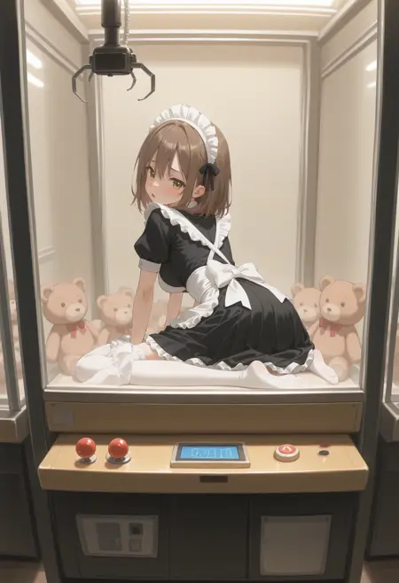 The trigger word alone is just to be inside a UFO catcher-like enclosure, so it is necessary to use crane game, sitting, thighhighs, indoors,in container, arcade, arcade cabinet, phone, phone booth, against, glass, reflection, wide shot, soles, etc. glass, reflection, wide shot, soles. The other prizes must be clearly specified, or the sample will be a teddy bear, which is a mystery object.