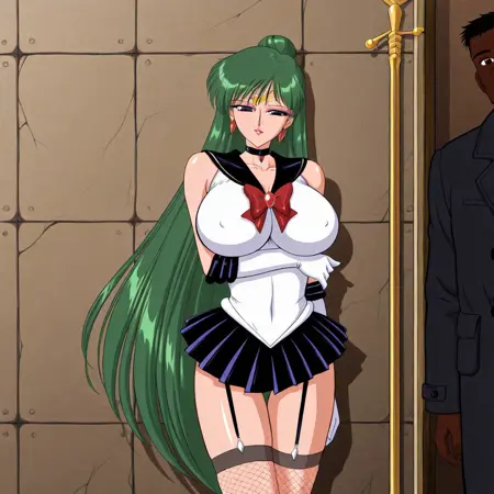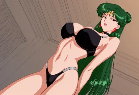 Sailor pluto. long hair, dark green hair, single hair bun, red eyes, circlet, sailor senshi uniform, white shirt, sleeveless shirt, back bow, red bow, (black sailor collar), brooch, white gloves, elbow gloves, (black skirt), pleated skirt, knee boots, earrings, black choker,