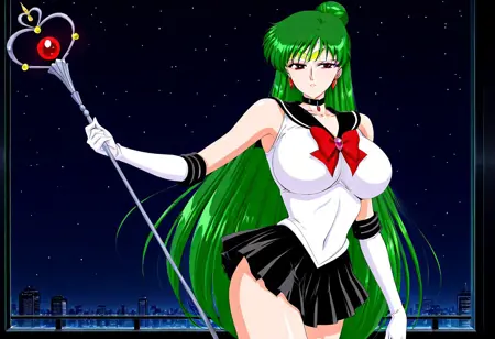 Sailor pluto. long hair, dark green hair, single hair bun, red eyes, circlet, sailor senshi uniform, white shirt, sleeveless shirt, back bow, red bow, (black sailor collar), brooch, white gloves, elbow gloves, (black skirt), pleated skirt, knee boots, earrings, black choker,