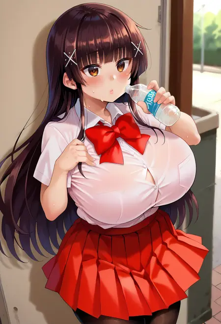 takayukashikikusako, 黑色长发, 棕色眼睛, x 发饰, 曲线身材, 巨乳