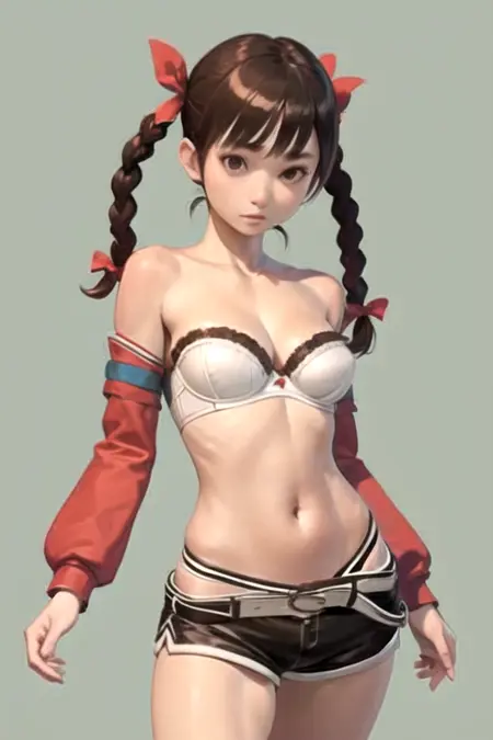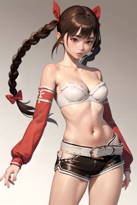 | トレーニングワード | AigleRumble, 1girl, solo, twin braids, long hair, brown hair, short shorts, navel, strapless bra, midriff, detached sleeves, long sleeves, brown eyes, black shorts, white bra, medium breasts, cleavage, belt, bow, twintails, micro shortsコピーしました! |