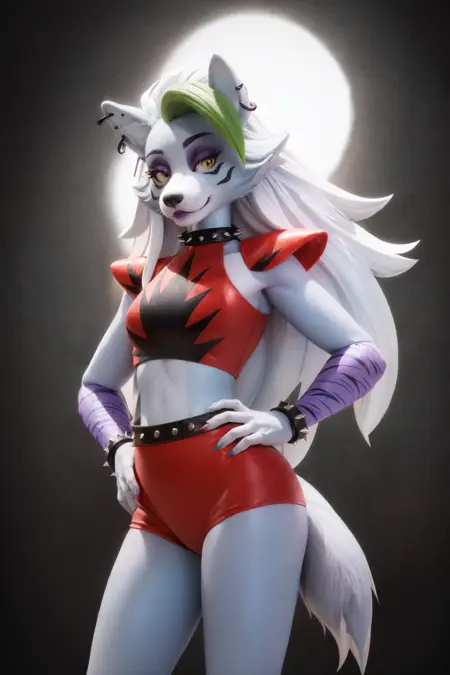 Trigger + Appearance: fnafroxanne, furry female, body fur, makeup, wolf ears, wolf tail