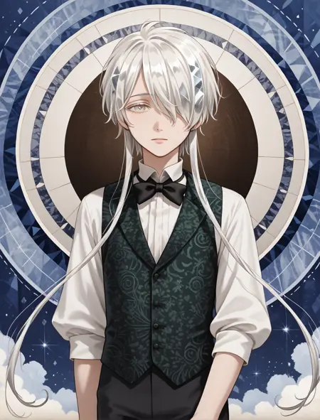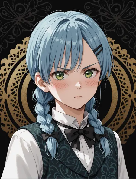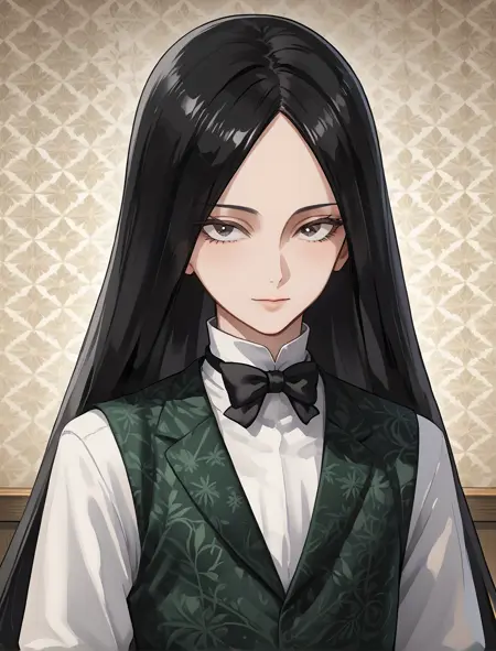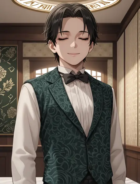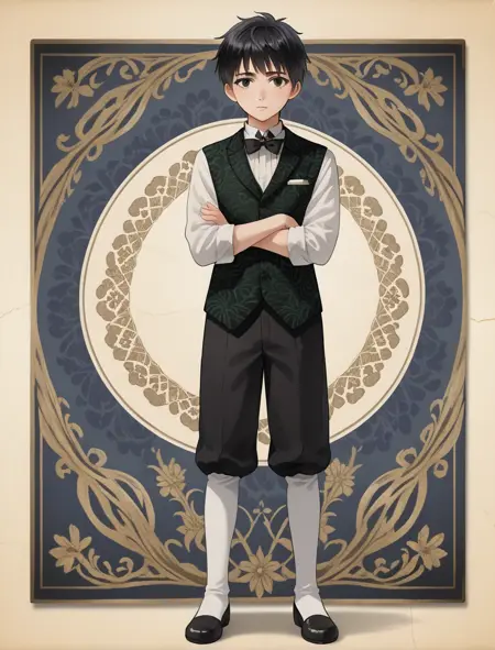 black neckbow, pattern on vest