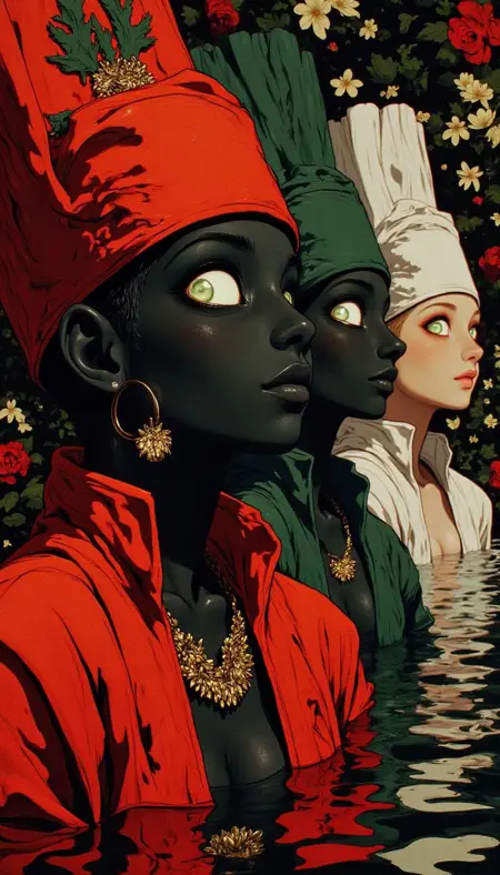 1. Bold Color Contrast: Dominated by deep reds and blacks, the colors create a menacing and dark environment, often with glowing highlights to emphasize eyes and ominous objects.