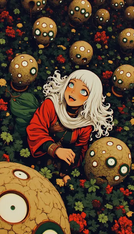 3. Fantasy-Horror Elements: Common themes include supernatural or horror motifs like haunted forests or creepy glowing entities (similar to jack-o'-lanterns with jagged, menacing smiles) that float around characters, enhancing the eerie atmosphere.