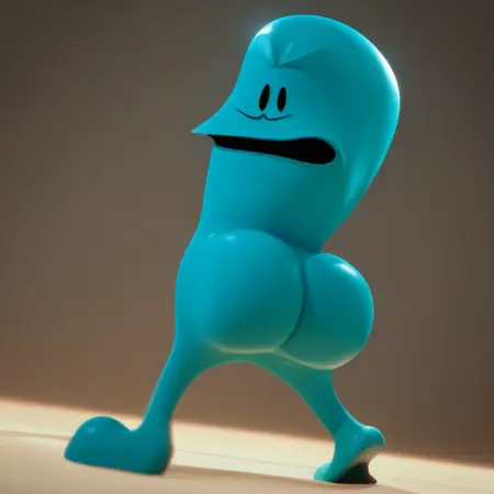 태그: Hobo Hobo, 파란 피부, 둥근 머리, 큰 눈썹, 큰 입, 검은 작은 눈, 검은 눈, 팔 없음, 손 없음, 큰 발, 큰 엉덩이, 엉덩이, 큰 엉덩이