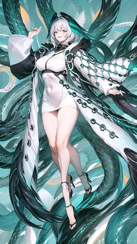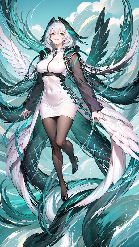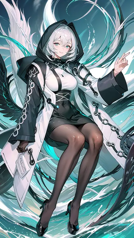 -->プロンプト:hoolheyak, pantyhose, grey hair, white dress, black footwear, black pantyhose, tail, dress, coat, open coat, breasts, head wings, hood, shoes, open clothes, white coat, large breasts, long sleeves, fingerless gloves, short hair, hair between eyes, hood up,