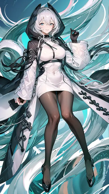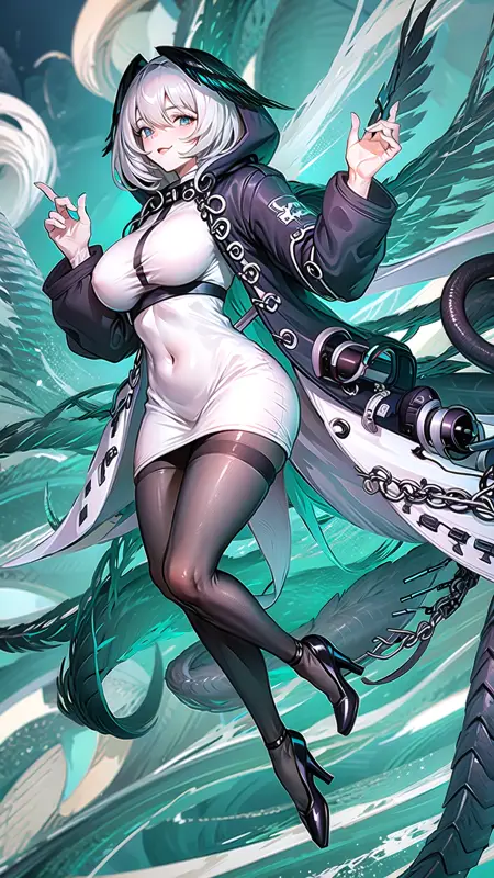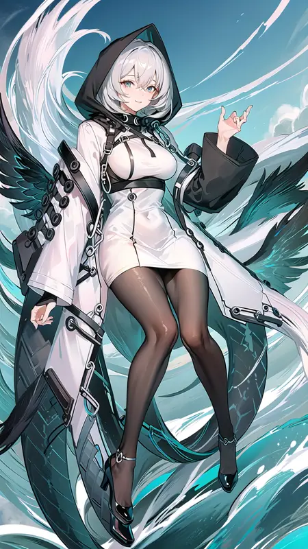-->提示词:hoolheyak, pantyhose, grey hair, white dress, black footwear, black pantyhose, tail, dress, coat, open coat, breasts, head wings, hood, shoes, open clothes, white coat, large breasts, long sleeves, fingerless gloves, short hair, hair between eyes, hood up,
