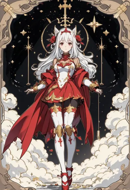- 推荐提示词:Card design, An animated image of a woman with long white hair and a crown on her head. She is wearing a red and white dress with a long red cape over her She is wearing a red and white dress with a long red cape over her shoulders. The woman is standing in front of a black background with white clouds on it. The woman is standing in front of a black background with white clouds on it.
