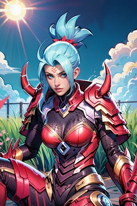 Prompt:, Airi_BL, 1girl, solo, long hair, braid, twin braids, bangs, asymmetrical bangs, blue hair, looking at viewer, blue eyes, facial mark, parted lips, closed mouth, breasts, armor, power armor, shoulder armor, gloves, bodysuit, boots, armor boots, high hell,