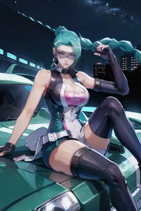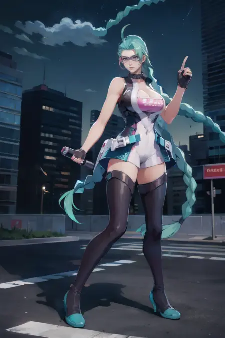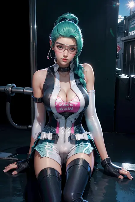 프롬프트: , Airi_RC, 1girl, solo, long hair, very long hair, braid, twin braids, multicolored hair, green hair, aqua hair, headset, looking at viewer, glasses, goggles, tinted eyewear, lips, collar, high collar, bare shoulders, cleavage, breasts, large breasts, gloves, fingerless gloves, elbow gloves, shorts, tight pants, white shorts, thighhighs, boots, thigh boots, high heels, shiny