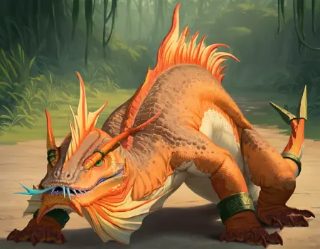“蝾螈是栖息于卢斯特里亚丛林沼泽和河口地区的巨型掠食性爬行动物。它们依靠四条粗壮的肌肉腿和一条强健的尾巴移动,无论在陆地还是水中都行动迅捷。