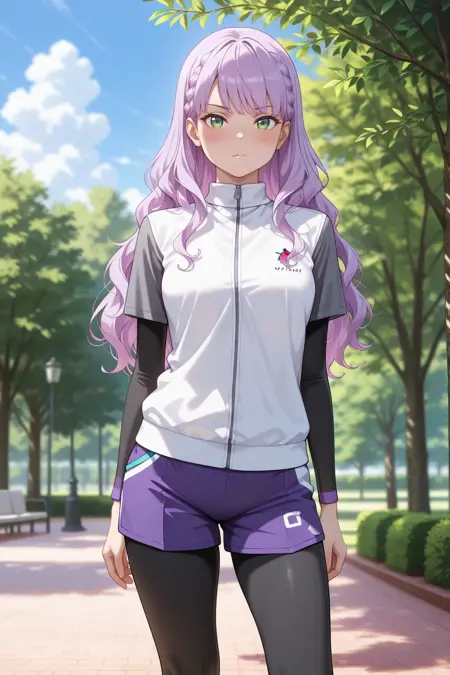 purple training shorts, black leggings under shorts, short sleeves, short over long sleeves, training shirt, layered sleeves,