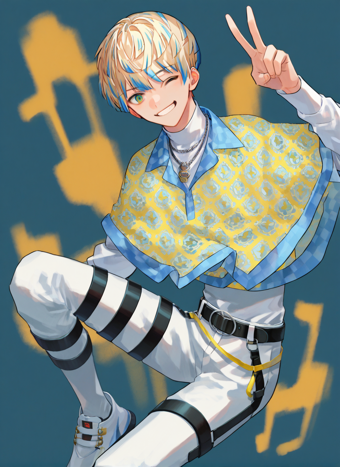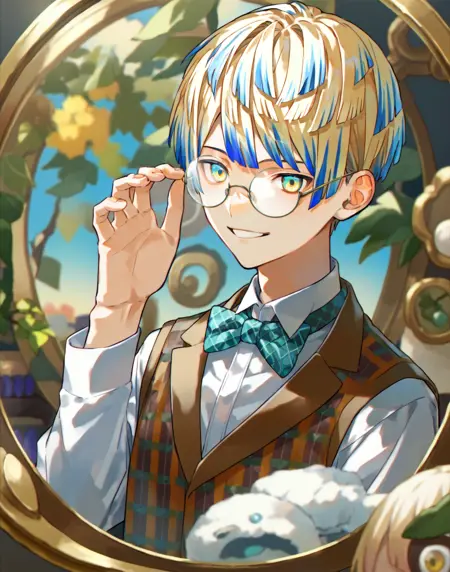 hibachi mana, blonde hair, blue hair, multicolored hair, aqua eyes, yellow eyes, gradient eyes