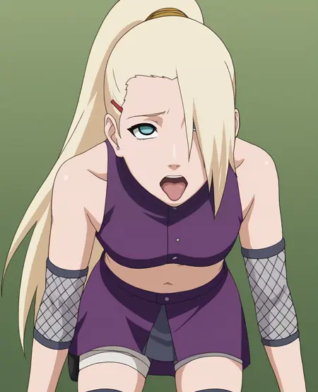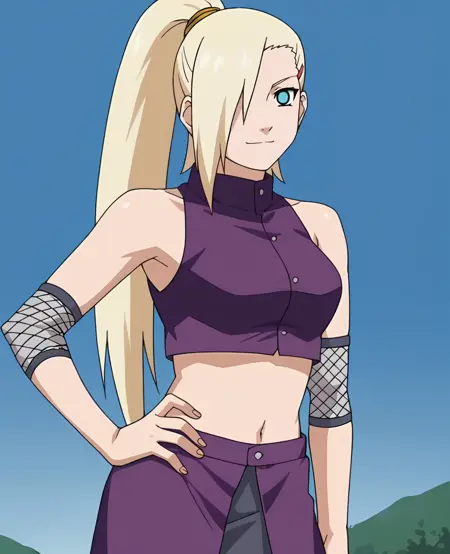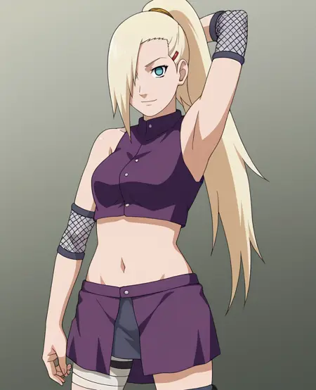 | トレーニングワード | inoy, blue eyes, blonde hair, long hair, hair over one eye, no pupils, ponytail, hairclipコピーしました! fishnet elbow pads, bandaged leg, skirt, midriff, navel, crop top, bandages, knee pads, elbow pads, fishnets, purple shirt, fishnet thighhighs,コピーしました! |