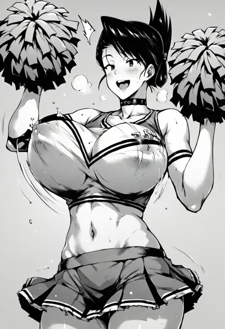OgaChiz, 1girl, cheerleader, black hair, folded ponytail, choker, large breasts, pom poms