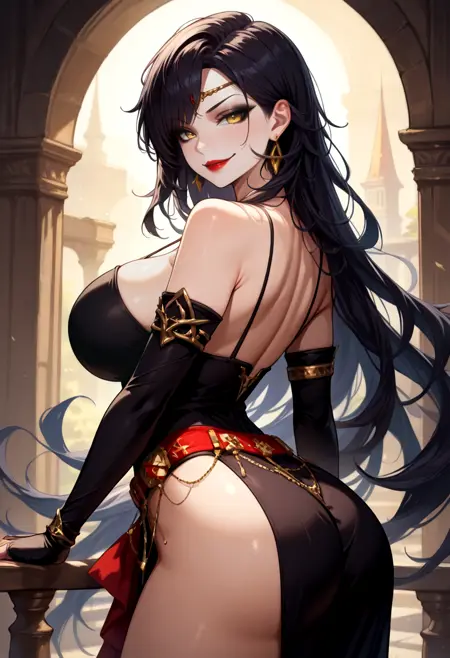 提示词:fe7snia, 黑色连衣裙,黑发,金色镶边,深V领,波浪发,长发,头冠,细吊带,高开衩,红色腰带,金色腰带,锁骨,裸露肩部,新娘手套,可拆卸袖子,高跟鞋,垂坠耳环,黄眼睛,