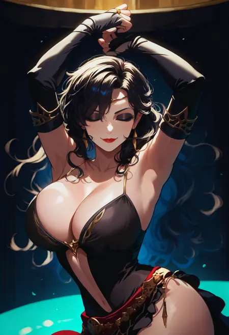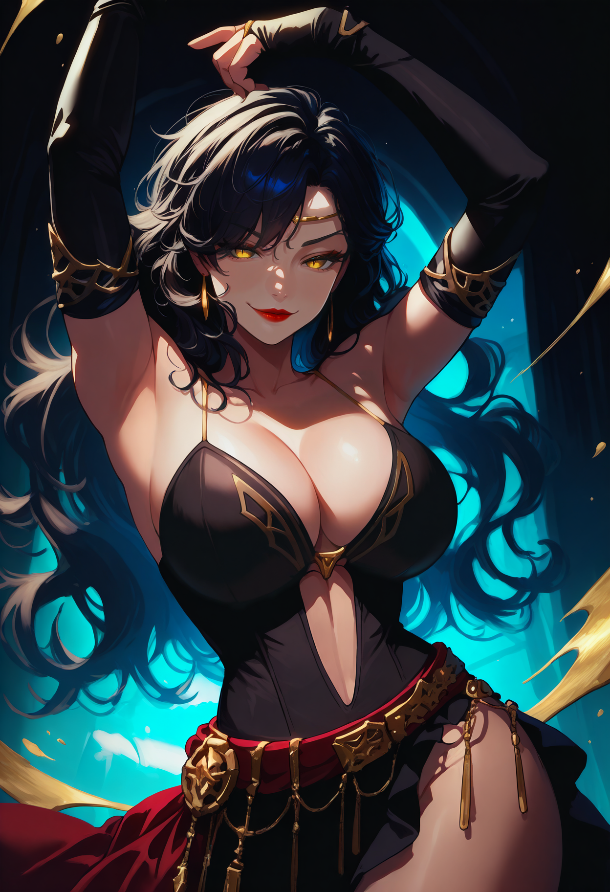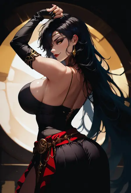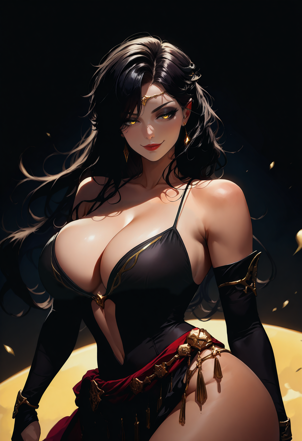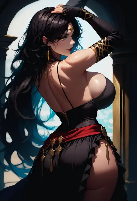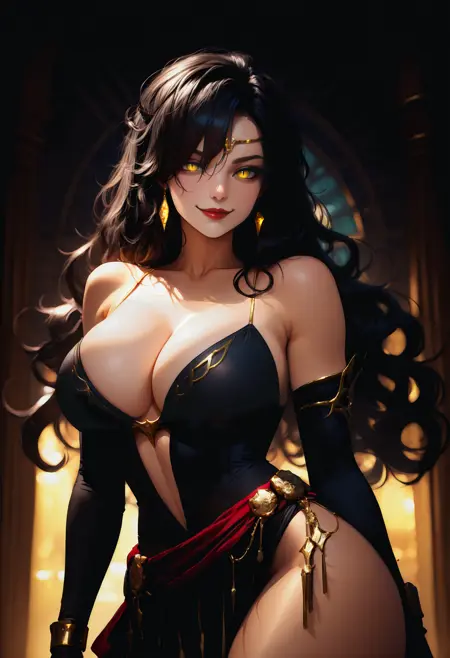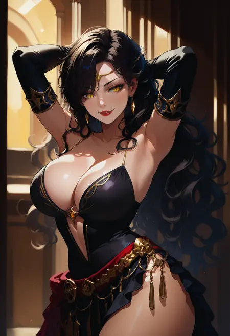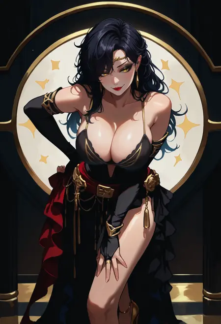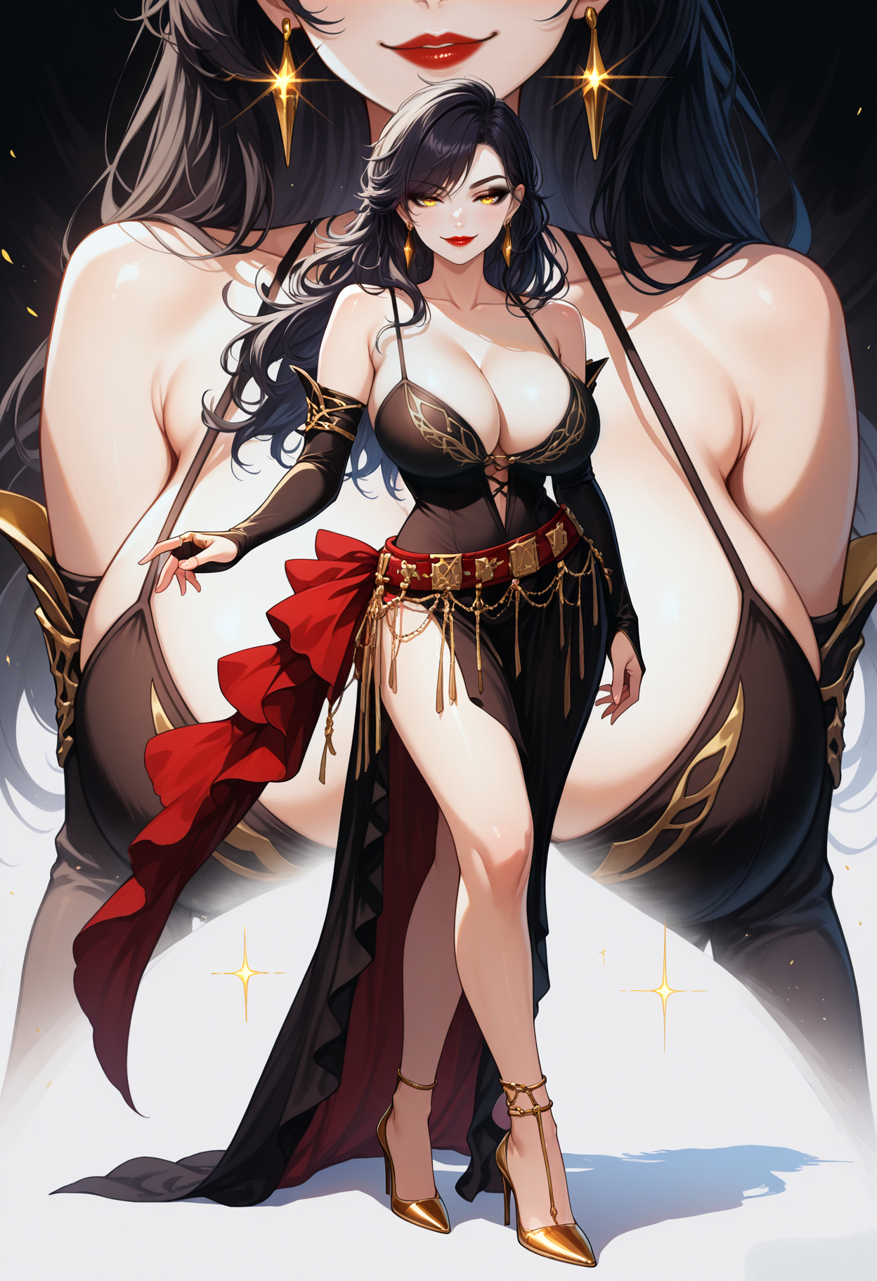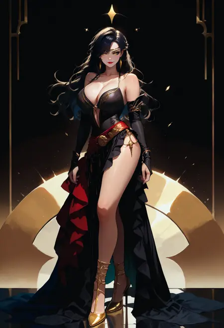Prompt: fe7snia, black dress, black hair, gold trim, plunging neckline, wavy hair, long hair, circlet, spaghetti strap, high cut, red sash, gold belt, collarbone, bare shoulders, bridal gauntlets, detached sleeves, high heels, dangle earrings, yellow eyes,
