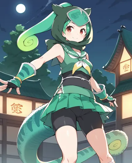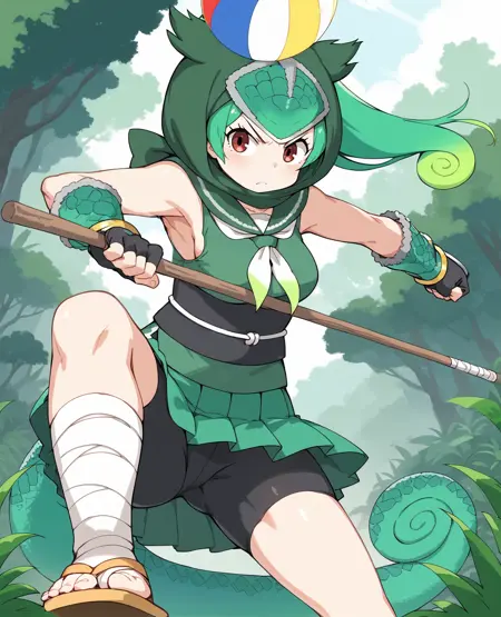 panther chameleon (kemono friends), green hair, hood, hood up, animal ear headwear, red eyes, green shirt, sailor collar, neckerchief, sleeveless, bracer, black gloves, fingerless gloves, sash, pleated skirt, green skirt, shorts under skirt, bike shorts, bandaged leg, sandals, lizard tail,