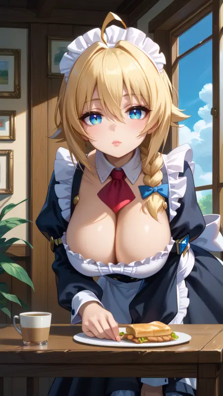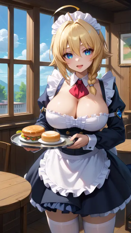 es_def, blue eyes, blonde hair, huge ahoge, single braid, long hair, dress, underbust, center frills, red necktie, white shirt, frills, wide sleeves, skirt, black pantyhose,