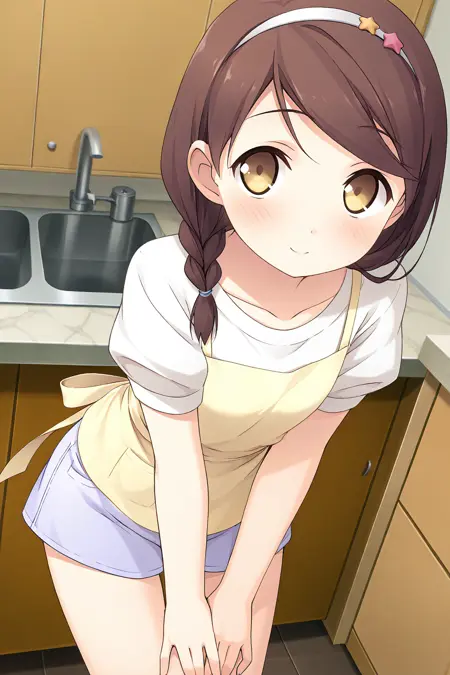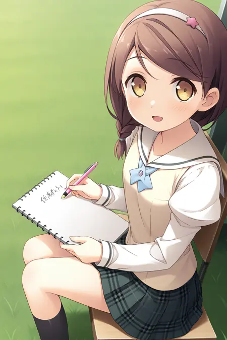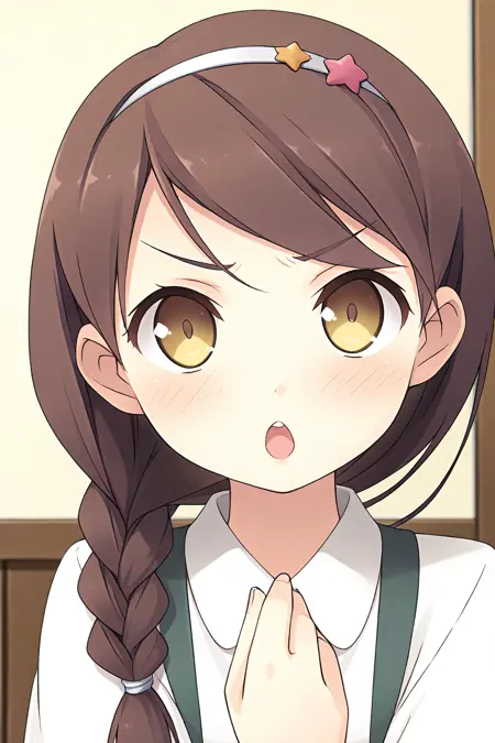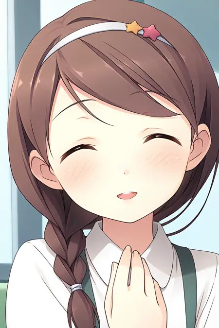 hirosaki kanade,brown eyes,yellow eyes,brown hair,short hair,swept bangs,single braid,side braid,hair over shoulder,hair tie,hairband,star hair ornament,