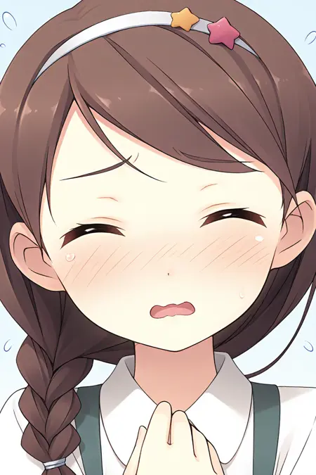 blush, closed eyes, facing viewer, flying sweatdrops, hand on own chest, hand up, hands up, nose blush, open mouth, upset, wavy mouth
