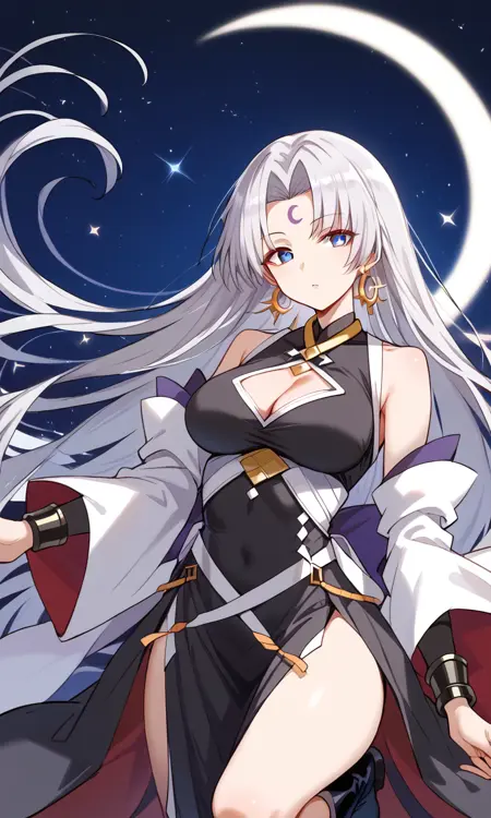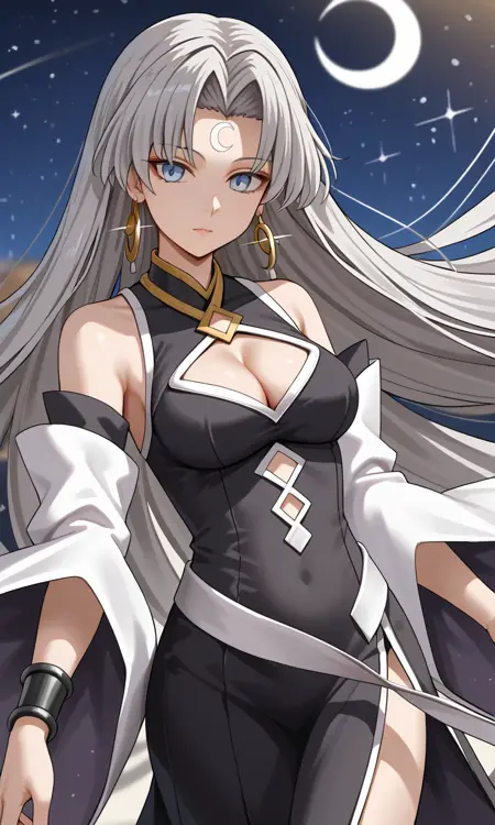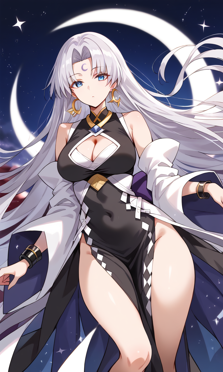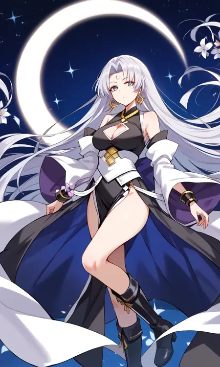 Takiyashahime, very long hair, grey hair, parted bangs, crescent moon forehead mark, pale blue eyes, earrings, jewelry, detached sleeves, white sleeves, bare shoulders, long dress, black dress, cutout dress, cleavage cutout, cleavage, black longboots, black bracelets