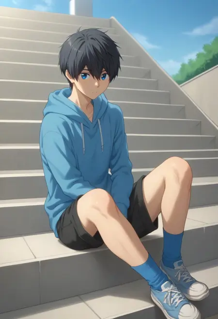 harukstart, 1boy, male focus, solo, black hair, short hair, hair between eyes, blue eyes, hoodie, hood, blue hoodie, shorts, black shorts,